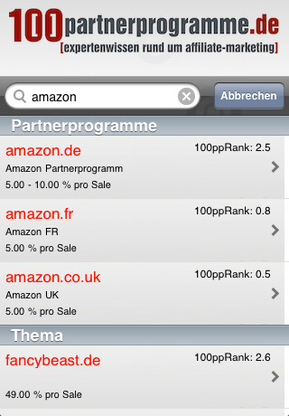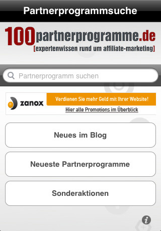 Seit Anfang November ist es eine neue, besonders für Affiliates sehr interessante, App verfügbar – bisher leider nur für iPhone und iPad Nutzer. 100partnerprogramme, eines der bekanntesten deutschen Affiliate Marketing Portale, hat den Sprung ins mobile Zeitalter gewagt und dabei gleich einen Volltreffer gelandet. Nutzer der App können die komplette Datenbank mit Informationen zu mehr als 6.000 Partnerprogrammen jetzt von jedem Ort aus abfragen und sich sogar direkt für das jeweilige Partnerprogramm registrieren. Abgerundet wird die App durch den Zugriff auf die aktuellen Sonderaktionen der Partnerprogramme und den Blog, in dem 100partnerprogramme-Betreiber Karsten Windfelder u. a. das Partnerprogramm der Woche vorstellt.