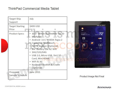 Heute sind geheime Bilder des mutmaßlichen ersten Android Tablets von Lenovo aufgetaucht, die laut Hinweis eigentlich als geheim eingestuft wurden (Lenovo Confidential). Beim Lenovo ThinkPad handelt es sich laut der US-Website ThisIsMyNext – auf der auch die geheimen Fotos veröffentlicht wurden – um ein 10,1 Zoll Tablet mit Android 3.0 (Honeycomb), einem 1 GHz Tegra 2 Dual Core Prozessor, 1280×800 Pixeln Auflösung und wahlweise 16 GB, 32 GB oder 64 GB internem Speicher. Ähnlich wie das ASUS Eee Pad Transformer scheint auch beim Lenovo ThinkPad eine Tastatur-Docking-Funktion ein entscheidendes Merkmal zu sein. Außerdem soll das Display auch per Stylus (Stift) zu bedienen sein. Darauf setzt u. a. auch das HTC Flyer. Erscheinen wird das ThinkPad laut den Fotos im Juli 2011, wobei es sich um den US-Termin handeln dürfte.