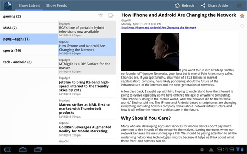 Die Geschwindigkeit, mit der sich der Android Market mit Apps füllt, die speziell für den Einsatz auf Tablets mit Android 3.0 (Honeycomb) erstellt wurden, ist durchaus ermutigend. Mit Newsr steht nun ein weiterer RSS Reader für Honeycomb zum kostenlosen Download bereit. Die App synchronisiert sich mit dem Google Reader und nutzt das größere Display zur übersichtlicheren Darstellung der Feeds. Weitere App für Android Tablets lassen sich in unserer Auswahl der besten Honeycomb Apps für Android finden; weitere RSS Reader bei den besten RSS Reader Apps für Android.