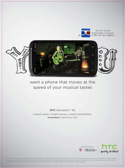 Die US-Plakatkampagne für das HTC Sensation von HTC und T-Mobile USA macht Gebrauch von der Google Goggles App. Wenn ein Android Nutzer das Plakat mithilfe von Goggles scannt, kann er anschließend einen kostenlosen Song der Band Boyer Rebellion als MP3 herunterladen. Dies berichtet die US-Website Androidguys. In der Vergangenheit hatte Google bereits mit den Marketing-Möglichkeiten seiner Goggles App experimentiert und konnte dabei namhafte Werbekunden für den Test gewinnen. Mit der Kampagne für das HTC Sensation wird das Potential von Goggles nun erstmals in einer regulären Werbekampagne untersucht.
