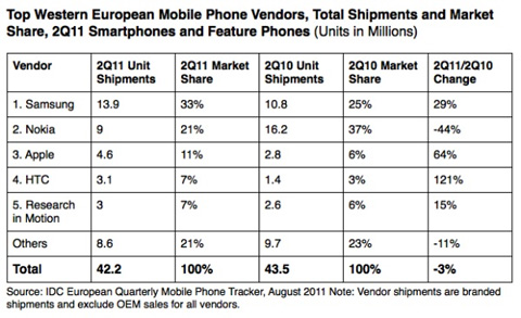Eine Studie von International Data Corporation (IDC) hat ans Licht gebracht, dass Samsung im zweiten Quartal 2011 in Europa die meisten Smartphones ausliefern konnte. Dies berichtet die US-Website Engadget. Ein großer Teil geht dabei natürlich auf das aktuelle Flaggschiff Samsung Galaxy S 2 zurück. Die folgenden Plätze belegen Nokia und Apple, den vierten Platz hat HTC inne. Auf Platz 5 findet sich hingegen der BlackBerry-Hersteller Research (RIM) in Motion wieder.