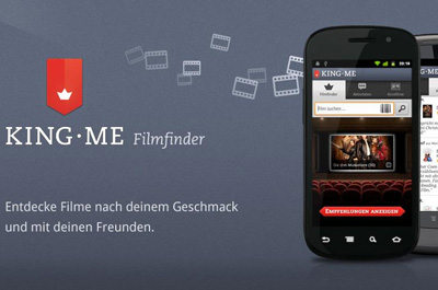 Mit der kostenlosen Filmfinder App von KING.ME können sich Android Nutzer anhand ihrer eigenen Interessen passende Filme vorschlagen lassen. Die Anmeldung bei Filmfinder erfolgt über Facebook oder Schueler.cc. Nun bewertet man zunächst selbst mindestens sieben bereits gesehene Filme und erhält auf Basis der Filmauswahl passende Tipps anderer Nutzer. Bei Kinostarts erfolgt eine Benachrichtigung über die Verfügbarkeit von Trailern. Mit dem integrierten Barcode-Scanner lassen sich außerdem Kauf-DVDs und Blu-Rays erkennen.
