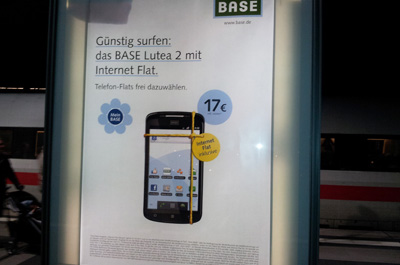 Wie man auf dem unten stehenden Foto – das Anfang November 2011 am Berliner Hauptbahnhof entstanden ist – sehen kann, hat die ganz aktuelle Preissenkung für das BASE Lutea 2 eine Höhe von 5 Euro. Denn wie AreaMobile heute berichtet, bietet BASE das Smartphone ab sofort zusammen mit seinem Sorglos-Tarif für nur noch 12 Euro pro Monat an. Die Vertragslaufzeit dauert 24 Monate und enthält wie bereits zuvor auch die passende Internet-Flat zum Surfen, Emails lesen, Apps herunterladen und vieles mehr. Über diesen Link gelangt man direkt zum Angebot im Base Online-Shop.