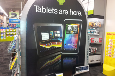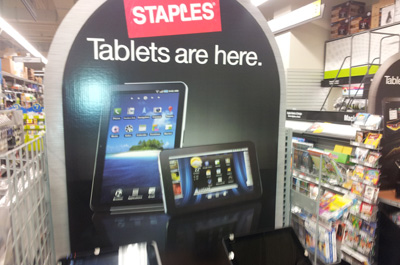 Teil 8 der kleinen Foto-Serie zur Android Präsenz im Süden der Vereinigten Staaten zeigt auf den ersten drei Bildern Präsentationsauslagen von Android Tablets bei der Bürofachmarkt-Kette Staples, die sich direkt vor den Kassen befinden und somit zu den dominantesten Verkaufsflächen des gesamten Marktes gehören. Besondere Aufmerksamkeit wird dabei wenig überraschend dem Amazon Kindle Fire geschenkt, wie das erste Foto deutlich zeigt. Aber auch andere Tablets lassen sich bei Staples kaufen, so beispielsweise das Motorola Xoom, das Toshiba Thrive, das HTC Flyer oder das Samsung Galaxy Tab 10.1.