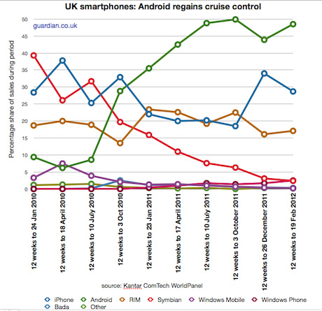 Die englische Tageszeitung The Guardian hat in seinem Blog neue Zahlen zur Verteilung der Marktanteile von mobilen Betriebssystemen veröffentlicht, die zuvor von Kantar Worldpanel ComTech ermittelt worden waren und den Zeitraum der 12 Wochen bis zum 19.02.2012 abdecken. Danach kommt Android aktuell auf 48,6% Marktanteil, nachdem Apple im Weihnachtsgeschäft dank der Veröffentlichung des iPhone 4S mit einem Anteil von 34% zeitweilig Boden gut machen konnte. Aktuell verlor Apple knapp 5,3% und steht bei 28,7%. Außerdem nennt The Guardian ebenfalls von Kantar ComTech ermittelte Marktanteile einiger weiterer Länder, für die vergleichsweise selten aktuelle Zahlen bereitstehen.