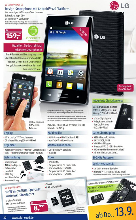 Das LG Optimus L5 ist 125 Gramm schwer und misst 11,80 x 6,70 x 1,00 cm. Die Garantiezeit beträgt 24 Monate. Nachfolgend noch die Abbildung aus dem Aldi Süd-Prospekt, die von der Website Markensysteme veröffentlicht wurde.