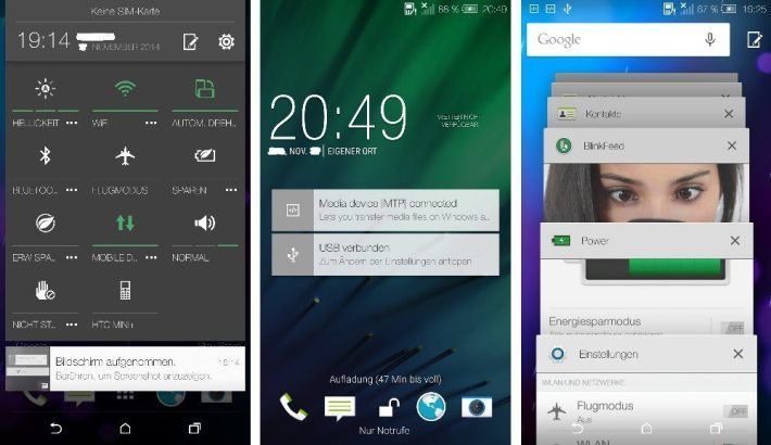 Gut zu erkennen sind auf den Screenshots die neuen Lollipop-Funktionen wie zum Beispiel die Anzeige von Benachrichtigungen auf dem Lockscreen, das Quick-Settings-Menü oder eine gestapelte Ansicht aller geöffneten Anwendungen. Im Gegensatz zu Google, wo man sich für kräftige Farben entschieden hat, ist das HTC-Design eher schlicht in Grautönen mit grünen Akzenten gehalten. Auffällig ist außerdem, dass man den herkömmlichen On-Screen-Tasten treu geblieben ist und hier nicht das neue Design übernommen hat.