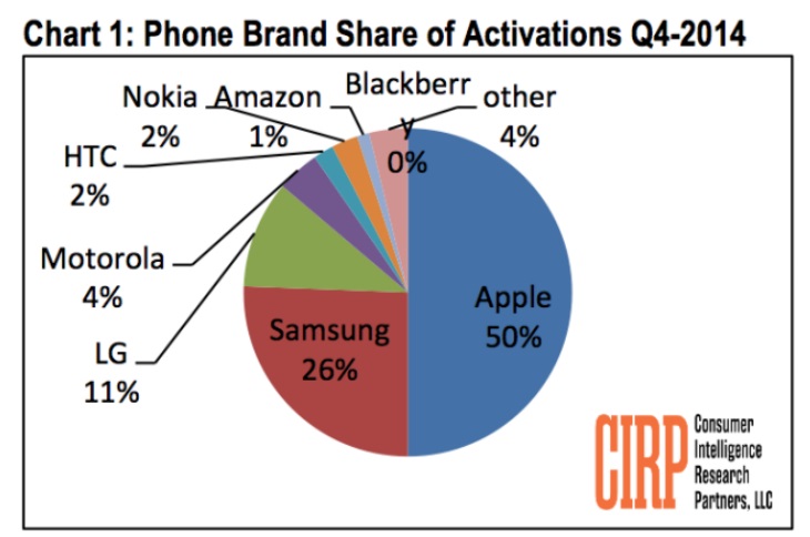 Das US-amerikanische Marktforschungsinstitut Consumer Intelligence Research Partners (CIRP) hat vor kurzem eine Studie veröffentlicht, die zeigt, wie die Verteilung der Smartphone-Marken im vierten Quartal von 2014 in der Bevölkerung aussah.