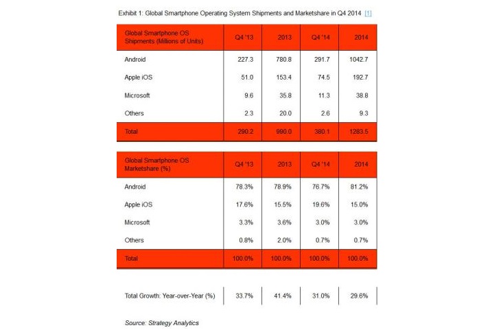 Nach diesen Einschätzungen konnte Apple in 2014 „nur“ 192,7 Millionen iPhones verkaufen. Davon wurden 74,5 Millionen Geräte allein im Weihnachtsquartal verkauft. Laut Strategy Analytics führt Android den Markt für Betriebssysteme mit 81,2 Prozent an. Apple besitzt dabei 15 Prozent, während sich Windows Phone mit 3 Prozent zufrieden geben muss. Die restlichen Anbieter wie Blackberry und Firefox machen zusammen einen Marktanteil von 0,3 Prozent aus.