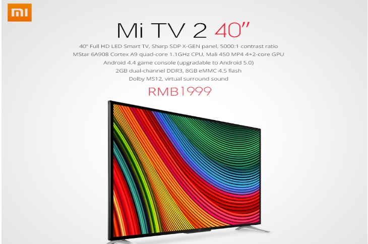 Der Mi TV 2 besitzt ein 40-Zoll Full-HD Display, das mit einem Sharp SDP X-GEN LED Licht und einem Kontrastverhältnis von 5000:1 für ein tolles Bild sorgt. Zur weiteren Ausstattung zählen ein MStar 6A908 SoC und ein quad-core Cortex A9 Prozessor. Der Arbeitsspeicher beträgt 2GB DDR3 und die interne Speicherkapazität 8GB.