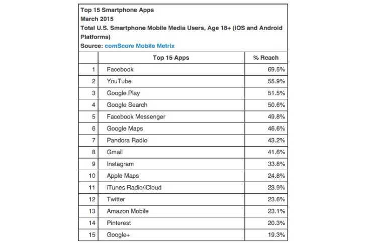 comScore hat auch eine Auflistung der 15 meist genutzten Apps in den USA herausgegeben. Auf Platz eins befindet sich die Facebook-App, die derzeit auf fast 70 Prozent aller Smartphones installiert ist. Auf den nächsten Plätzen befinden sich YouTube, Google Play und Google Search.