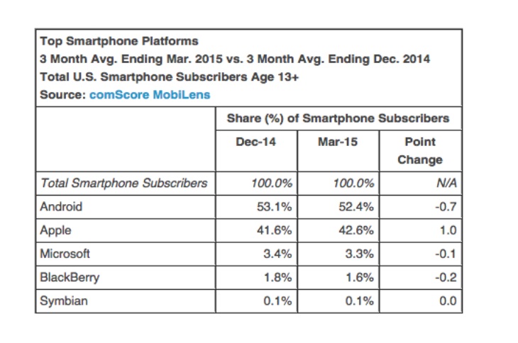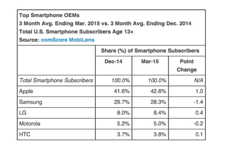 Der erfolgreichste Smartphone-Hersteller in den USA ist Apple. Mit einem Marktanteil von 42,6 Prozent konnte der iPhone-Hersteller im Vergleich zum Dezember 2014 einen Prozentpunkt hinzugewinnen. Weiterhin auf Rang zwei ist der südkoreanische Hersteller Samsung platziert, dessen Marktanteil derzeit bei 28,3 Prozent liegt. Samsung musste allerdings aufgrund schwächelnder Absatzzahlen in den letzten drei Monaten 1,4 Prozentpunkte abgeben. Rang drei, vier und fünf befinden sich die Hersteller LG, Motorola und HTC, die zusammen 17,7 Prozent Marktanteil besitzen.