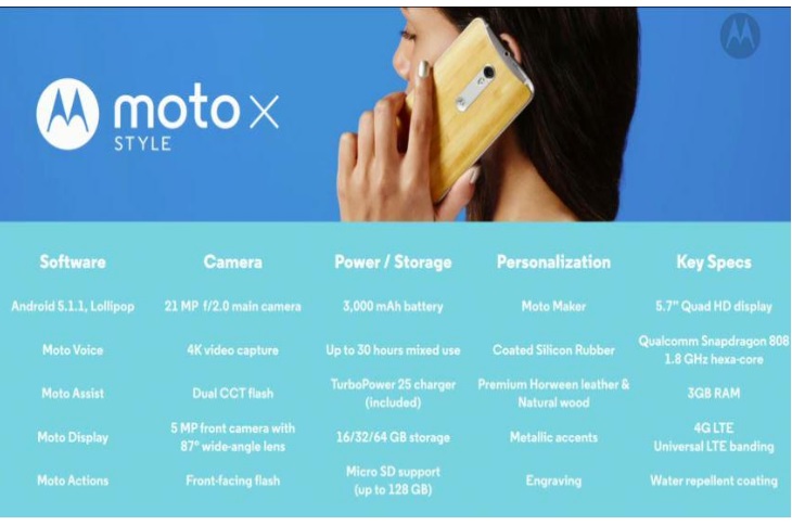 Das QHD LCD Display des Moto X Style misst 5,7-Zoll in der Diagonale. Beim Prozessor hat sich der Hersteller für einen Snapdragon 808 entschieden. Dieser wird mit einem Arbeitsspeicher von 3GB angetrieben. Die Hauptkamera löst mit 21 GB auf. Für eigene Dateien stehen dem Smartphone-Nutzer 16 GB an interne Speicherkapazität zur Verfügung. Dank des MicroSD-Slots können weitere Kapazitäten generiert werden. Des Weiteren liegt die Akkuleistung bei 3.000 mAh. Als Betriebssystem kommt Android Lollipop zum Einsatz. Dank der Moto Maker-Funktion kann das X Style individuell auf die speziellen Bedürfnisse des Nutzers angepasst werden.