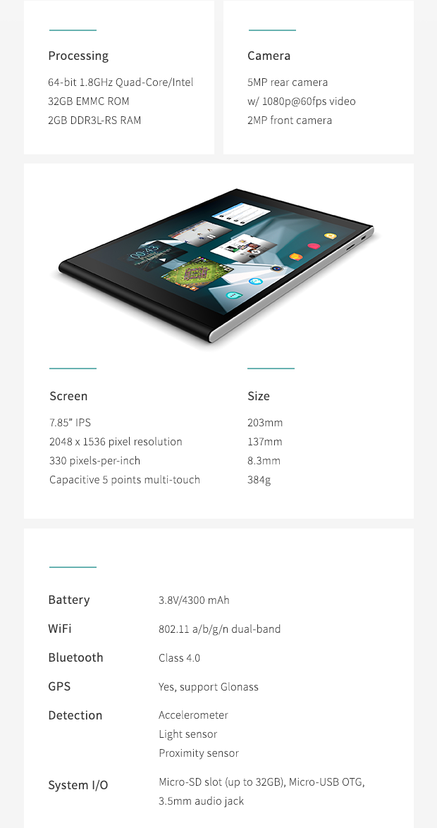 Das 7,9“ große IPS Display löst mit 2048 x 1536 Pixeln auf. Unter der Haube werkelt ein vierkerniger, 64-Bit Intel Atom Z3735F Prozessor, der mit 1.8 GHz getaktet ist. Das Gerät läuft unter Sailfish OS 2.0 und hat ein Gestik-basiertes Interface. Auf der Rückseite ist eine 5 MP Rückkamera verbaut, während auf der Vorderseite eine 2 MP Kamera für angemessene Selfies sorgen soll. Zusätzlich wird das Device durch 2 GB RAM unterstützt und bietet einen microSD-Kartenslot an. Während ein 4450 mAh-Akku die nötige Leistung liefern soll, unterstützt das Device leider keine LTE-Geschwindigkeit.