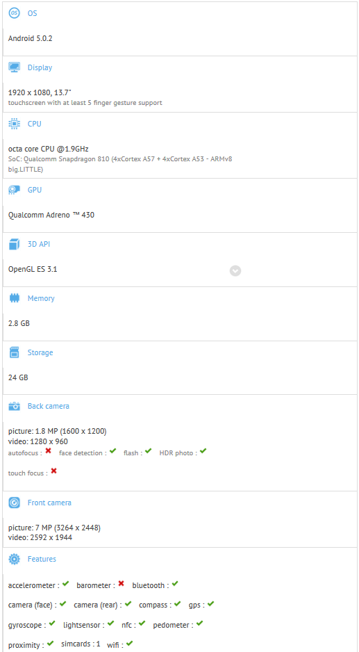 Bei dem Benchmarktest auf GFXBench sind natürlich auch einige technische Daten zum neuen Tablet aufgetaucht. Das ZTE Axon soll demnach ein 13,7“ Display mit einer Auflösung von 1080 x 1920 erhalten. Daraus ergibt sich eine Pixeldichte von 160ppi. Zudem wird es Qualcomms derzeitigen Top-Chipsatz – den Snapdragon 810 – unter der Haube haben, der einen „leicht“ gedrosselten Achtkernprozessor mit 1,9 GHz Taktfrequenz beinhaltet. Die Adreno 430 GPU kümmert sich um die grafischen Anforderungen.