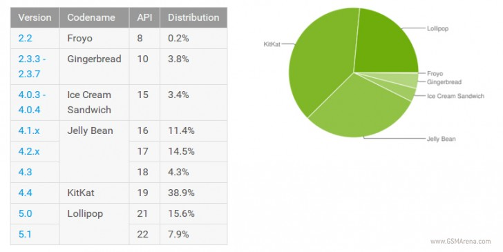Ältere Versionen werden bei dieser Übersicht nicht mehr angezeigt. Grund dafür ist, dass für die Statistik auf Daten aus der neuen Play Store App zurückgegriffen wurde und dieselbe lediglich von Android-Versionen ab 2.2 Froyo oder neuer unterstützt wird. Im nächsten Monat werden wir erstmalig Android 6.0 Marshmallow auf der Übersicht sehen können, denn das neuste Betriebssystem wird schon in Kürze für die aktuellen Nexus- und Android-One-Geräte zur Verfügung stehen.