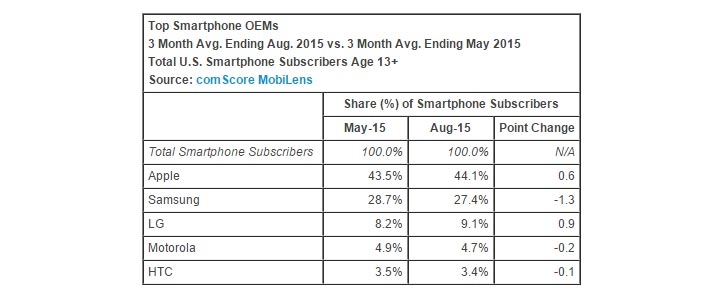Wie aus der Tabelle zu entnehmen ist, besaßen in den untersuchten drei Monaten rund 44 Prozent der Smartphone-Nutzer ein iPhone. Damit steht Apple aktuell an der Spitze der Smartphone-Hersteller. Mit etwas Abstand folgt der Südkoreaner Samsung. Rund 28 Prozent der US-Smartphone-Besitzer nutzen ein Gerät von Samsung. LG, Motorola und HTC rangieren auf den Plätzen drei, vier und fünf.
