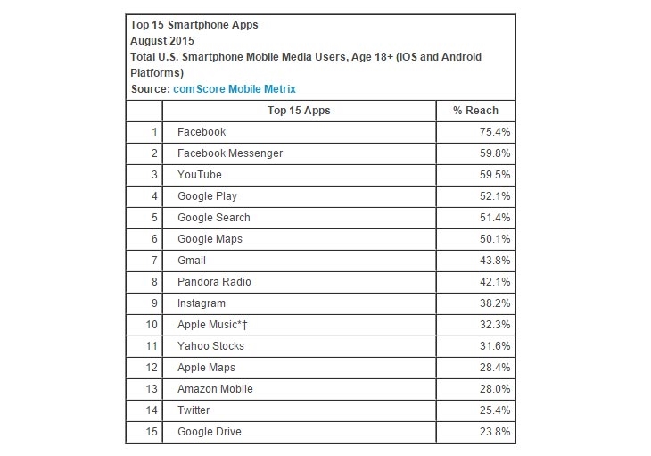 comScore hat ebenfalls eine Analyse zu den erfolgreichsten Apps in den USA veröffentlicht. Dabei kam heraus, dass die normale Facebook-App (75,4 %) und der Facebook-Messenger (59,8 %) am meisten verwendet wurden. Die YouTube-App rangiert auf dem dritten Platz und wurde auf fast 60 Prozent der Smartphones installiert. Dahinter taumeln vier Google-Apps: Google Play, Google Search, Google Mail und Gmail sind jeweils mindestens auf jedem zweiten Smartphone heruntergeladen worden.