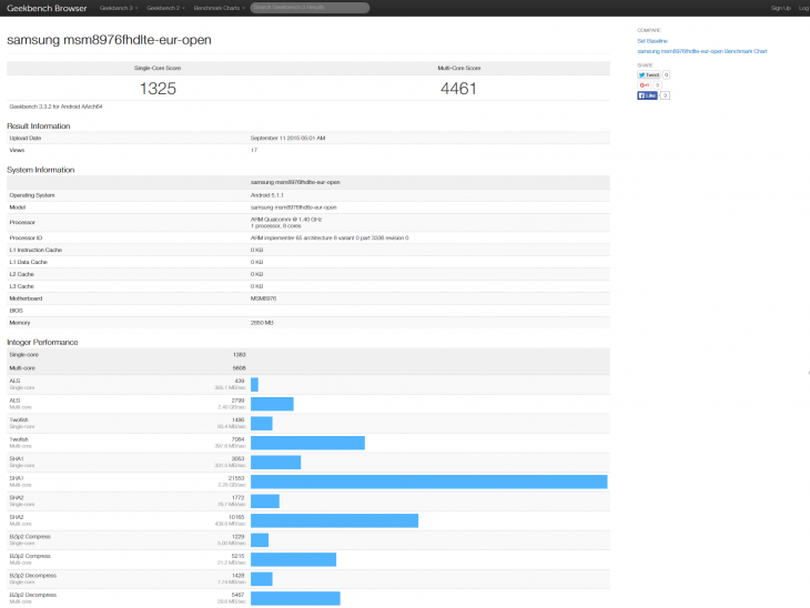 In etwa vor einem Monat ist außerdem der dargestellte Geekbench-Test aufgetaucht, der wie es aussieht, ebenfalls das Galaxy A9 als Bezugsobjekt hatte. Das Device konnte dabei mit 1325 Punkten im Ein-Kern-Test (single-core) und 4461 Punkten im Mehr-Kern-Test (multi-core) wirklich großartige Ergebnisse erzielen. Wie gut diese Werte in Wirklichkeit sind wird bei dem Vergleich mit Smartphones anderer Hersteller sehr schnell deutlich. Das HTC One M9, das mit dem Snapdragon 810 ausgestattet ist, konnte bei dem identischen Test 3738 und 1112 Punkte erreichen (im Mehr-Kern- und Ein-Kern-Test) und das OnePlus 2 3673 sowie 876 Punkte.