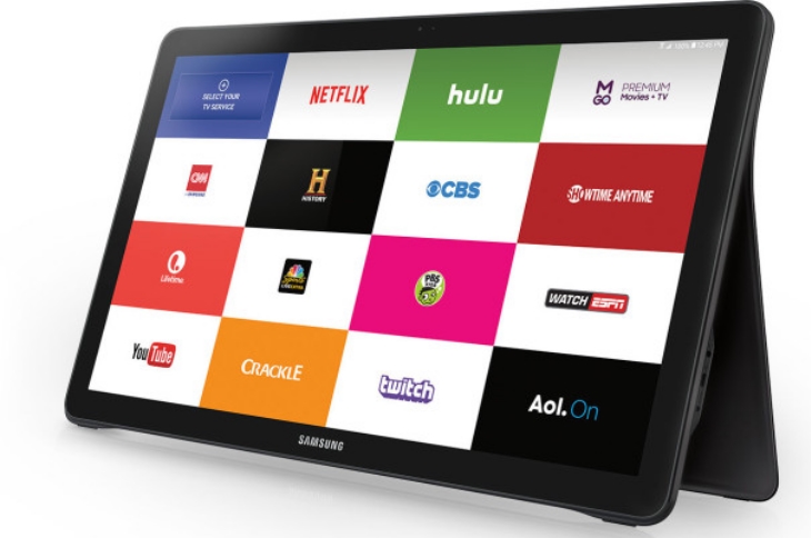 Halb-Tablet, Halb-Fernseher – Das Samsung Galaxy View sieht aus wie ein Tablet, mit der Ausnahme, dass es verhältnismäßig riesig ist. Das Display misst 18,4 Zoll in der Diagonale. Damit eignet sich der Newcomer vor allem für Spiele, Filme und Serien.