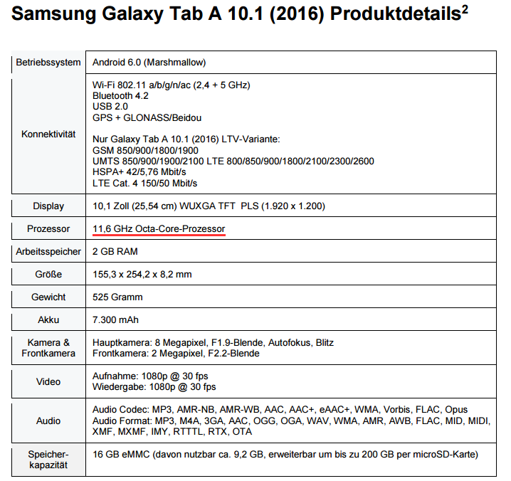 Wie der Name bereits vermuten lässt, ist das Galaxy Tab A 10.1 (2016) mit einem 10,1“-Display ausgestattet (1200 x 1920). Als Betriebssystem ist Android 6.0 Marshmallow vorinstalliert und es wird von einem Achtkernprozessor (aller Wahrscheinlichkeit nach dem Exynos 7870) angetrieben. Obwohl das offizielle Listing eine Taktfrequenz von 11,6 GHz ausweist (siehe Bild), handelt es sich hierbei offensichtlich nur um einen Tippfehler, denn der Prozessor ist logischerweise mit 1,6 GHz getaktet.