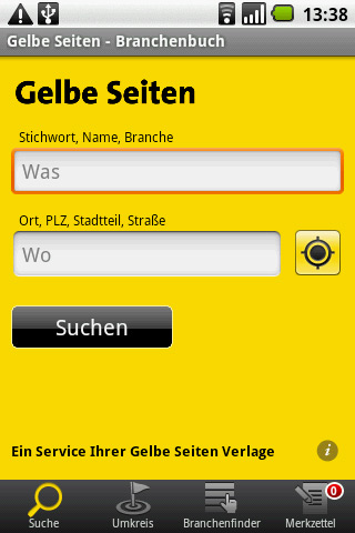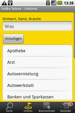 Die weiteren Buttons in der Fußleiste („Umkreis“ und „Branchenfinder“) unterscheiden sich etwas von der Suche. Während der Unterschied bei „Umkreis“ darin liegt, dass es keine manuelle Eingabemöglichkeit des Standorts gibt, kann der Nutzer beim „Branchenfinder“ durch Menüs mit Einträgen wie z. B. „Auto & Verkehr“, „Hotels & Gastronomie“ oder „Bauen & Renovieren“ bis zum gewünschten Eintrag navigieren. Auf dem Merkzettel hingegen findet er alle die Einträge wieder, die er aus den Ergebnislisten heraus dort gespeichert hat.