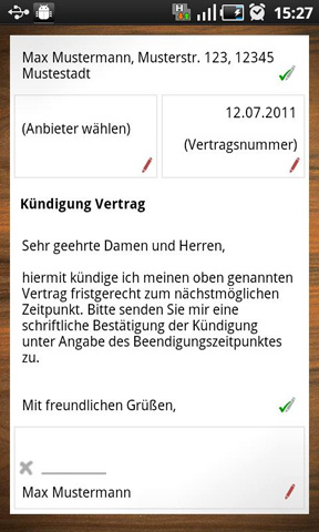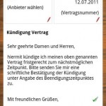 Nach dem Öffnen der App öffnet sich direkt eine Faxvorlage, bei der nur einige Daten des Nutzers ergänzt werden müssen. Besonders praktisch erweist sich die Möglichkeit, aus einer Liste von potentiellen Anbietern wählen zu können, bei denen die Kündigung vorgenommen werden soll. In der Liste sind eine Vielzahl von Mobilfunkunternehmen, Versicherungen, Zeitschriftenverlage etc. mitsamt Adressen verzeichnet. Weitere Einträge können bei Bedarf manuell hinzugefügt werden.