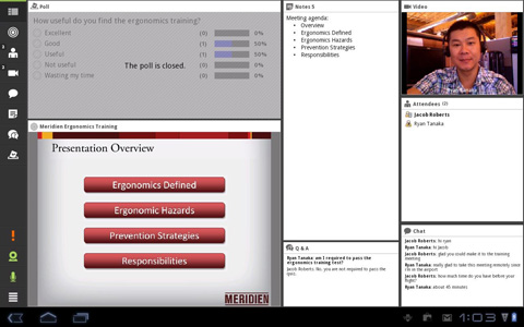 10. Adobe Connect Mobile Video-Konferenzen per Android Smartphone oder Tablet lassen sich mit Adobe Connect Mobile realisieren. Nutzer können eigene Konferenzen initiieren oder an Meetings teilnehmen, zu denen sie eingeladen wurden. Störenfriede eigener Konferenzen lassen sich jederzeit ausschließen. Außerdem stehen diverse Funktionen zum Zeigen von Präsentationen während einer Session bereit. Adobe Connect Mobile kann kostenlos aus dem Android Market heruntergeladen werden.