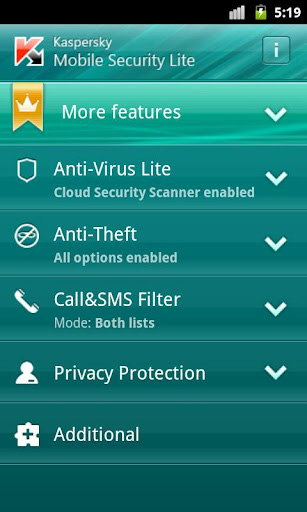 8. Kaspersky Mobile Security Die Lite-Version von Kaspersky Mobile Security warnt den Nutzer vor potentiell gefährlichen Apps auf dem Android Smartphone oder Tablet. Die kostenpflichtige Vollversion bietet hingegen einen Rundumschutz gegen Schadsoftware aller Art und zusätzlich Diebstahlschutz, einen Anruf- und SMS-Filter und einiges mehr. Kaspersky Mobile Security Lite kann kostenlos aus dem Google Play Store heruntergeladen werden.