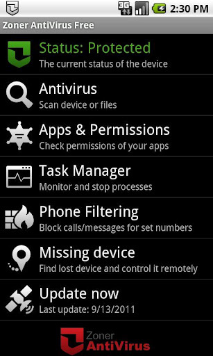 9. Zoner AntiVirus Free Zoner AntiVirus Free bietet Android Nutzern Schutz vor Viren, Dialern, Trojanern, Würmern und anderer Malware und überwacht Telefonanrufe und Nachrichten. Dazu kommen weitere Funktionen wie eine Kindersicherung und Diebstahlschutz. Für Besitzer von Android Tablets steht eine spezielle Tablet-App von Zoner AntiVirus Free zur Verfügung. Die Zoner AntiVirus Free App steht kostenlos im Google Play Store zum Download bereit.