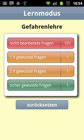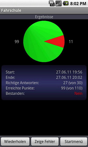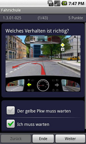 5. Auto Führerschein Die App Auto Führerschein verfügt über einen Lern- und Testmodus und verwendet das Leitner-Lernkartenprinzip für effizientes Lernen der Prüfungsfragen. Schwierige Fragen können abgespeichert und somit gezielt geübt werden. Es ist auch möglich, die Fragen um eigene Notizen zu ergänzen. Der Timer (30 Minuten) simuliert die Bedingungen der Theorieprüfung in der Fahrschule. Neben der Autoführerschein werden im Android Market separate Apps für die Vorbereitung auf die theoretische Führerscheinprüfung für Motorräder, Mofas und Leichtkrafträder angeboten.