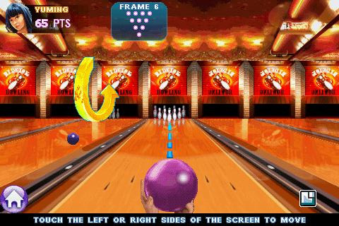 6. Midnight Bowling 2 Gamelofts Midnight Bowling 2 führt den Spieler auf Bowling-Bahnen in der ganzen Welt, die in leuchtender 3D-Optik in Szene gesetzt werden. Dort stellen sich ihm jeweils Gegner mit unterschiedlichem Talent entgegen. Daher kann er sich zunächst im Trainingsmodus mit der Touchscreen-Steuerung vertraut machen, mit der er den Laufweg des Balles auch beim Zurollen auf die Pins noch beeinflussen kann.