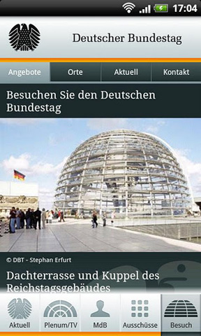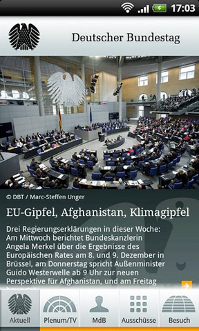 10. Deutscher Bundestag Neuigkeiten aus der Herzkammer der Politik direkt auf das Android Smartphone oder Tablet: Die offizielle App des Deutschen Bundestags informiert über Tagesordnungen von Plenarsitzungen, Zusammensetzung und Aufgaben der verschiedenen Ausschüsse, die Mitglieder des Bundestags der laufenden Legislaturperiode und Möglichkeiten für Besuche im Berliner Reichstag. Außerdem lassen sich die Plenarsitzungen als Video- oder Audiostream live mitverfolgen. Die App des Deutschen Bundestags kann kostenlos aus dem Android Market heruntergeladen werden.