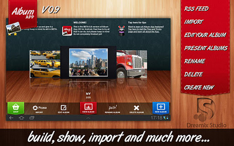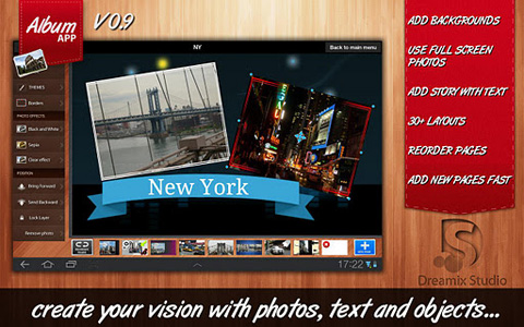 4. Album App HD Mit Album App HD können Nutzer von Tablets mit Android 3.0 (Honeycomb) oder höher ihre Fotos in Fotoalben sortieren und diese mit den angebotenen Stilen und Werkzeugen optisch personalisieren. Im integrierten Shop können außerdem weitere Grafikstile erworben werden. Die Fotoalben können aus unendlich vielen Seiten bestehen, per Email versandt und über soziale Netzwerke mit Freunden geteilt werden.