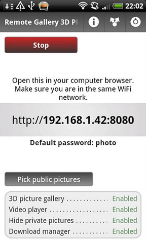 6. Remote Gallery 3D PRO Mit Remote Gallery 3D PRO können alle Fotos auf dem Smartphone drahtlos über eine WLAN-Verbindung auf dem PC oder Fernseher angesehen bzw. überspielt werden. Dies geschieht mithilfe des Browsers (z. B. Google Chrome, Firefox oder Internet Explorer). Gegenüber der kostenlosen Version können mit der PRO-Variante einzelne Fotos versteckt und Multi-Uploads vorgenommen werden.