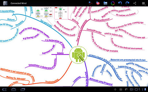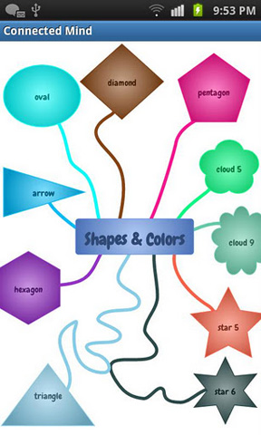 2. Connected Mind (mind mapping) Auch mit Connected Mind (mind mapping) lassen sich nützliche Mind Maps durch Fingerbewegungen auf dem Touchscreen hervorzaubern. Für die Knotenpunkte stehen 27 verschiedene Formen in unterschiedlichen Farben zur Verfügung. Auch ansonsten kann sich der Funktionsumfang von Connected Mind (mind mapping) sehen lassen, bis hin zu einer Tablet-optimierten Ansicht. Die erstellten Mind Maps lassen sich auf Knopfdruck mit Freunden über Twitter, Facebook, Google Plus etc. teilen.