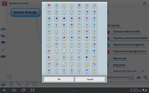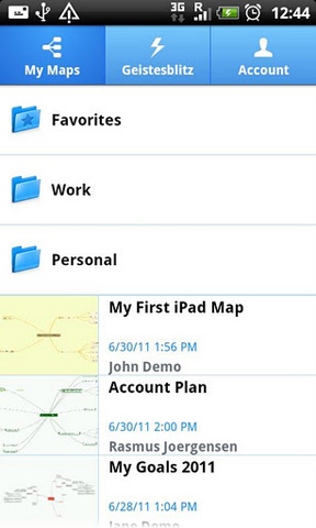 5. MindMeister (mind mapping) Mit MindMeister (mind mapping) erstellte Mind Maps können optional über einen kostenlosen MindMeister-Account online gesichert werden und stehen anschließend auf jedem anderen Gerät mit MindMeister-Zugang zur Verfügung. Der Nutzer kann eigene Icons, Farben und Map-Themes hinzufügen, wodurch er optisch kaum eingeschränkt ist. Über das Geistesblitz-Widget kann er außerdem Ideen direkt vom Homescreen des Android Smartphones aus eingeben. MindMeister (mind mapping) kann kostenlos aus dem Android Market heruntergeladen werden.