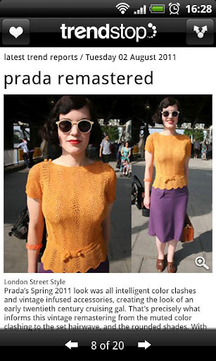 | 10. trendstop trendtracker Mit der trendstop trendtracker App behalten Android Nutzerinnen den Überblick über Fashion-News, aktuelle Trends auf dem Laufsteg, kommende Trends und vieles mehr. Abgerundet wird die App mit Infos und Bildern der wichtigsten Fashion-Shows aus Mailand, New York, Berlin etc. trendstop trendtracker steht kostenlos zum Download im Android Market bereit. |