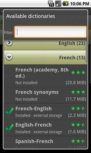 Speziell für die Offline-Nutzung zu gebrauchen ist die Offline Wörterbücher App. Für mehr als 50 Sprachen lassen sich Wörterbücher auf die SD-Karte des Android Smartphones oder Tablets herunterladen. Optional können Nutzer sich die Ergebnisse ihrer Suche auch vorlesen lassen. Offline Wörterbücher kann kostenlos bei Google Play heruntergeladen werden.