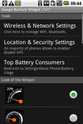 10. Gauge Battery Widget Mit einer analogen Darstellung in der Art eines Tachometers unterscheidet sich das kostenlose Gauge Battery Widget von allen anderen Akku-Widgets. Der Nutzer hat die Wahl zwischen verschiedenen Designs in drei unterschiedlichen Größen (1×1, 2×1 und 2×2). Der Akkustand wird zum einen als Prozentwert, und zu anderen als Tachonadel angezeigt. Auf Wunsch lässt sich der Akkuladestand auch in der Statusleiste darstellen, ebenso wie die Akkutemperatur.