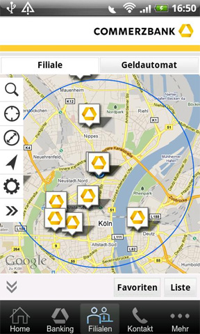 3. Commerzbank Die App bietet Commerzbank-Kunden neben einer Suchfunktion für Filialen und Geldautomaten sowie Service-Nummern mobilen Zugriff auf das komplette Banking- & Brokerage-Angebot der Commerzbank. Damit lassen sich Inlandsüberweisungen tätigen (auch auf die eigene Kreditkarte), Vorlagen anlegen sowie Kontostände und Kreditkartenumsätze abrufen. Auch der Kauf von Aktien direkt aus der App heraus ist möglich. Alle wichtigen Kurse und Marktdaten werden gleich mitgeliefert. Die Commerzbank App kann kostenlos aus dem Android Market heruntergeladen werden.