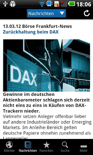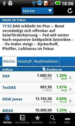 4. Finanzen.net Börse & Aktien Die App von Finanzen.net gibt einen schnellen Überblick über den deutschen und andere wichtige Finanzmärkte. Im eigenen Depot befindliche Aktien lassen sich als Favoriten abspeichern und können so jederzeit schnell aufgerufen werden. Neben den Indizes und Aktienkursen gibt die App auch Auskunft über Optionsscheine und Derivate. Abgerundet wird das Angebot mit Nachrichten und Marktberichten.