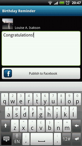 Mit EboBirthday lassen sich neben Geburtstagen natürlich auch Hochzeitstage und andere Daten verwalten. Die App synchronisiert sich mit dem Kalender und Adressbuch des Android Smartphones und optional auch mit Facebook (die Synchronisation mit den Google Kontakten ist über das separat erhältliche und kostenlose Plugin EboBirthday Contact Sync möglich). Auf Wunsch kann der Nutzer dem Geburtstagskind direkt eine SMS oder Email mit Glückwünschen senden. Mit dem integrierten Widget lassen sich die nächste Geburtstage auf dem Homescreen anzeigen. EboBirthday kann kostenlos aus dem Android Market heruntergeladen werden.