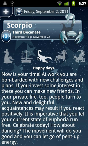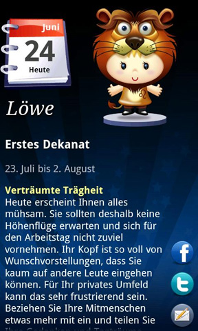 3. Horoskop HD Pro Deutsch Vom renommierten Schweizer Astrologie-Zentrum kommen die Horoskope von Horoskop HD Pro. Die kostenlose Version bietet das Tageshoroskop für den aktuellen und morgigen Tag, während die kostenpflichtige Pro-Version zusätzlich ein Wochenhoroskop mitbringt. Die Horoskope für alle Sternzeichen werden mit hübschen Grafiken dargestellt und lassen sich auf Knopfdruck mit Freunden über Facebook und Twitter teilen.