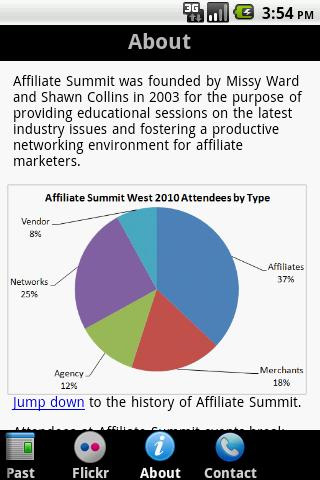 6. Affiliate Summit Die Affiliate Summit Marketing Conference existiert seit 2003 und findet inzwischen zweimal jährlich statt. Seit 2009 geschieht dies im Wechsel zwischen New York City (Affiliate Summit East) und Las Vegas (Affiliate Summit West). Mit der offiziellen Android App der Affiliate Summit haben Nutzer Zugriff auf das Konferenzprogramm, eine Sprecher-Übersicht, den Affiliate Summit Blog etc. und können sich direkt aus der App heraus für die jeweils nächste Konferenz registrieren. Die Affiliate Summit App kann kostenlos aus dem Android Market heruntergeladen werden.