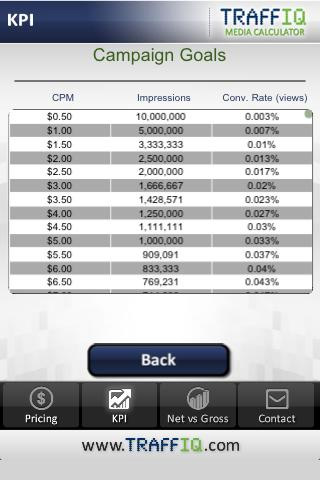 5. TRAFFIQ Media Calculator Zur Kalkulation von Online-Werbekampagnen ist der TRAFFIQ Media Calculator geeignet. Damit lassen sich durch Eingabe des Budgets und anderer Parameter Zielgrößen errechnen, die beim Erreichen der Online-Marketing-Ziele behilflich sind. Auch der KPI (Key Performance Indicator) lässt sich mit der App bestimmen. Der Download des TRAFFIQ Media Calculators ist kostenlos.