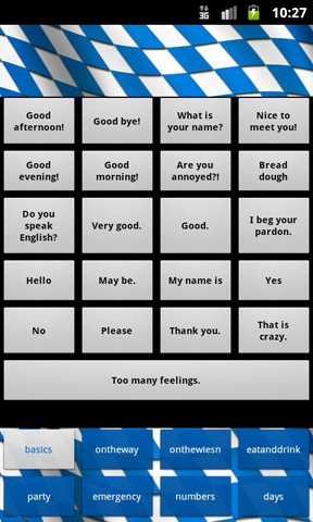 Um sich auf dem Oktoberfest angemessen verständigen zu können, schadet das Aneignen von einigen Bayrisch-Kenntnisse unter keinen Umständen. Glücklicherweise gibt es die Bayrisch für Anfänger App, mit der sich einige lebensnotwendige Wörter und Sätze im Handumdrehen erlernen lassen. Dazu gehören u. a. die Begrüßung, das Fluchen, Orts- und Zeitangaben, Bestellungen im Wirtshaus und einiges mehr.