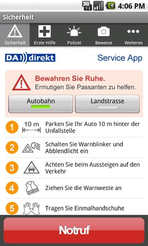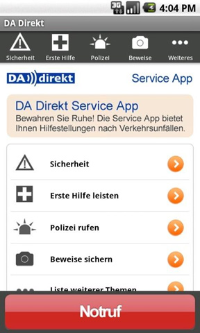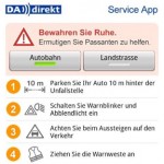 4. DA Direkt Service App Bei der im Schadensfall notwendigen Kontaktaufnahme mit der Autoversicherung von DA Direkt hilft Kunden die kostenlose DA Direkt Service App. Außerdem bietet die App eine Schritt-für-Schritt Hilfe für die Bereiche Sicherung des Unfallorts, Erste Hilfe, Polizeiruf und andere Notrufnummern, Beweissicherung (inklusive direktem Zugriff auf die Kamera-Funktion des Smartphones) usw. Dazu kann der Unfallort automatisch per GPS-Position übermittelt werden.