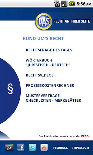6. D.A.S. Rechtsschutz D.A.S. ist die Rechtsschutzversicherung der Ergo Gruppe. Aus der App heraus können Kunden bei D.A.S. anrufen und kostenfreie Hilfe bei Rechtsproblemen erfragen (mit Rückruf-Service), sich spezialisierte Anwälte aus dem D.A.S.-Netzwerk empfehlen lassen oder um Mediation bitten. Außerdem bietet die App ein Jura-Wörterbuch, Musterverträge und Checklisten, Rechtsvideos und einen Prozesskostenrechner. Der Download der App aus dem Google Play Store ist kostenlos möglich.