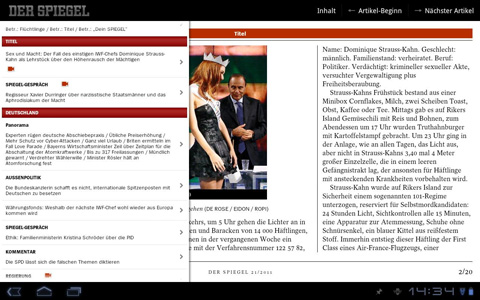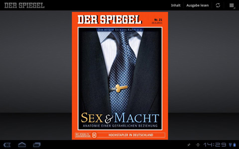 7. DER SPIEGEL Die gedruckte Ausgabe des Spiegels als Epaper auf dem Android Smartphone oder Tablet ist dank der App von DER SPIEGEL komfortabel möglich. Die aktuelle Ausgabe steht schon sonntagsmorgens zum Herunterladen bereit. Die App selbst kann kostenlos heruntergeladen werden, das Abo des Spiegel Epapers kann aus der App heraus gekauft werden.